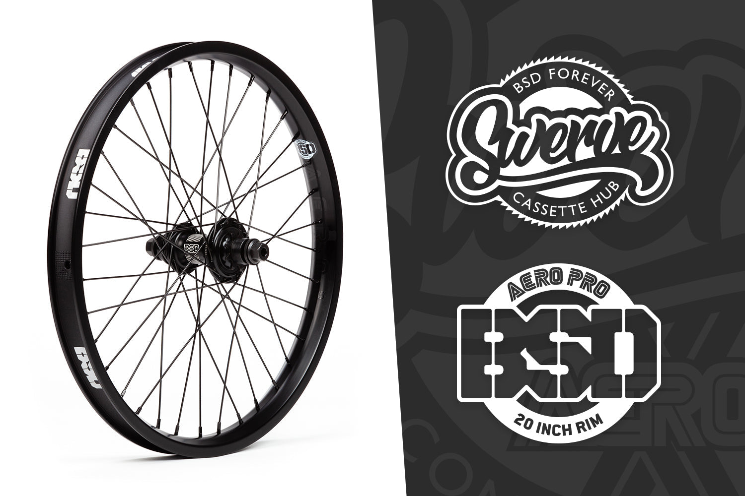 A complete BSD skatepark and street ready rear cassette wheel built using the BSD Swerve cassette hub and BSD Aero Pro rim.