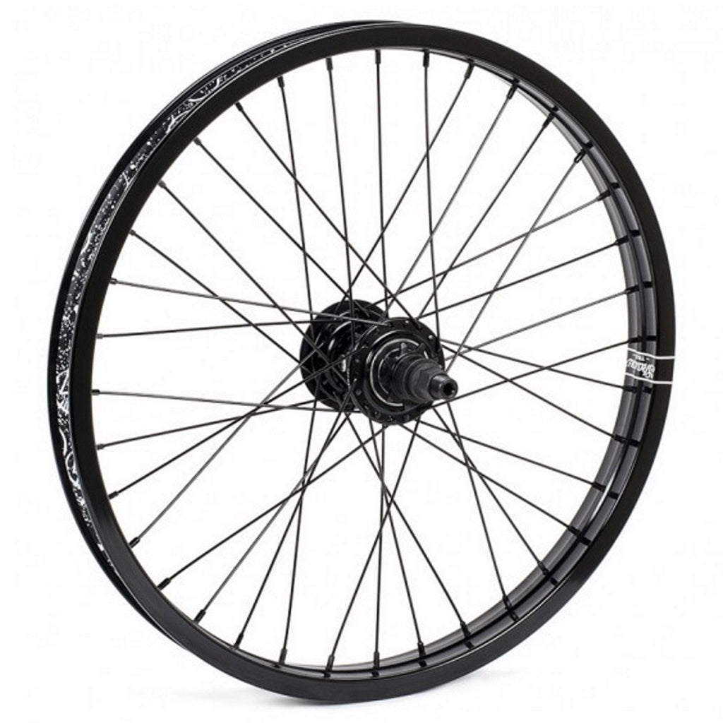 Shadow's pre-laced Optimized Freecoaster Wheel, assembled using completely aftermarket products. Shadow's Optimized Freecoaster is made using a 6061 Aluminium shell, heat-treated hollow Chromoly axle and features a completely new axle along with a Nylon clutch retention spring. By replacing the traditional spring and ball system, the new hub requires less maintenance and is a lot easier to disassemble. The Nylon retention spring also reduces the internal drag and enables faster rolling and smoother crankflips. Laced to the Shadow Truss Rim with it's bridge inspired structuring and double wall design with Shadow Straight Spokes. Supplied with the non-drive side guard and rim tape.