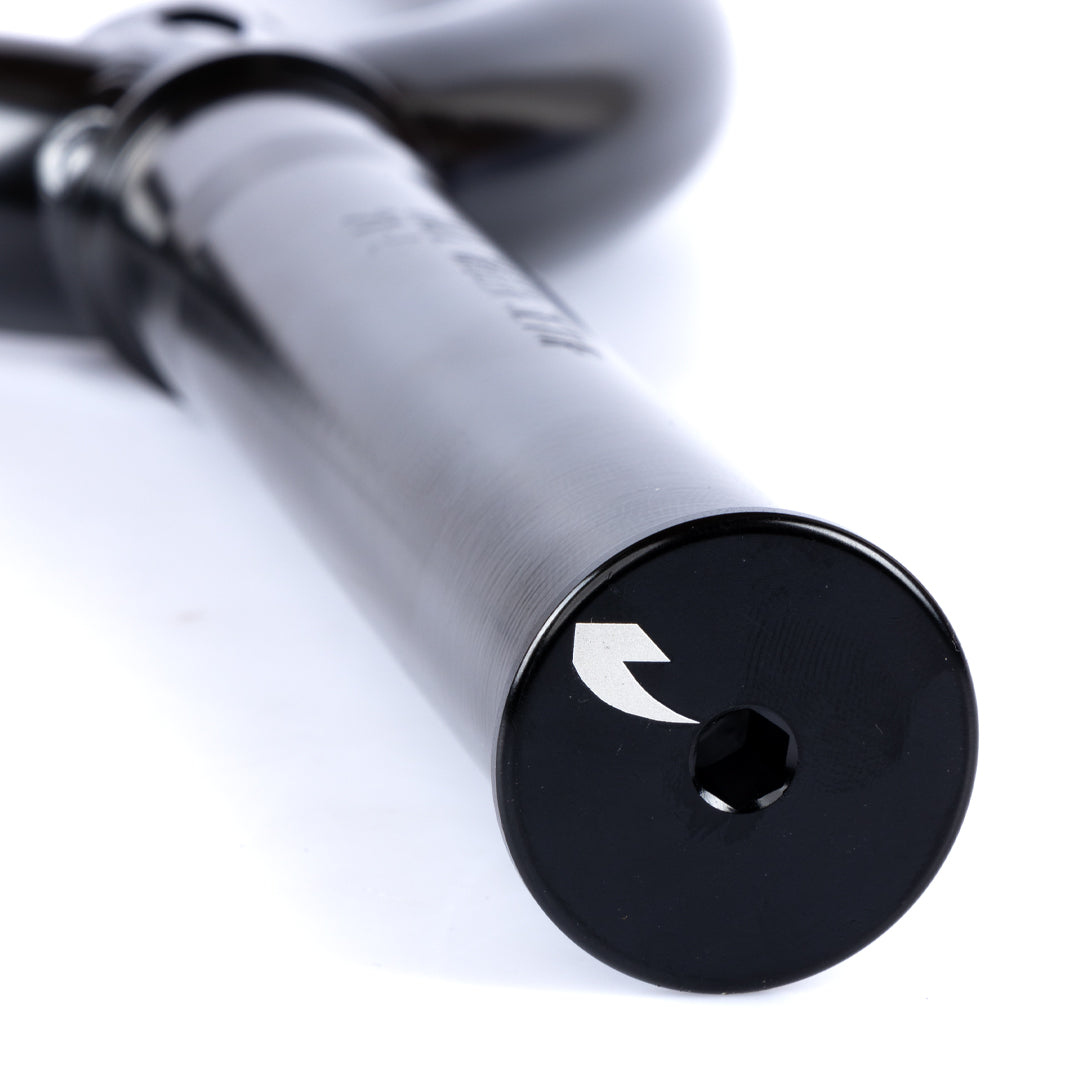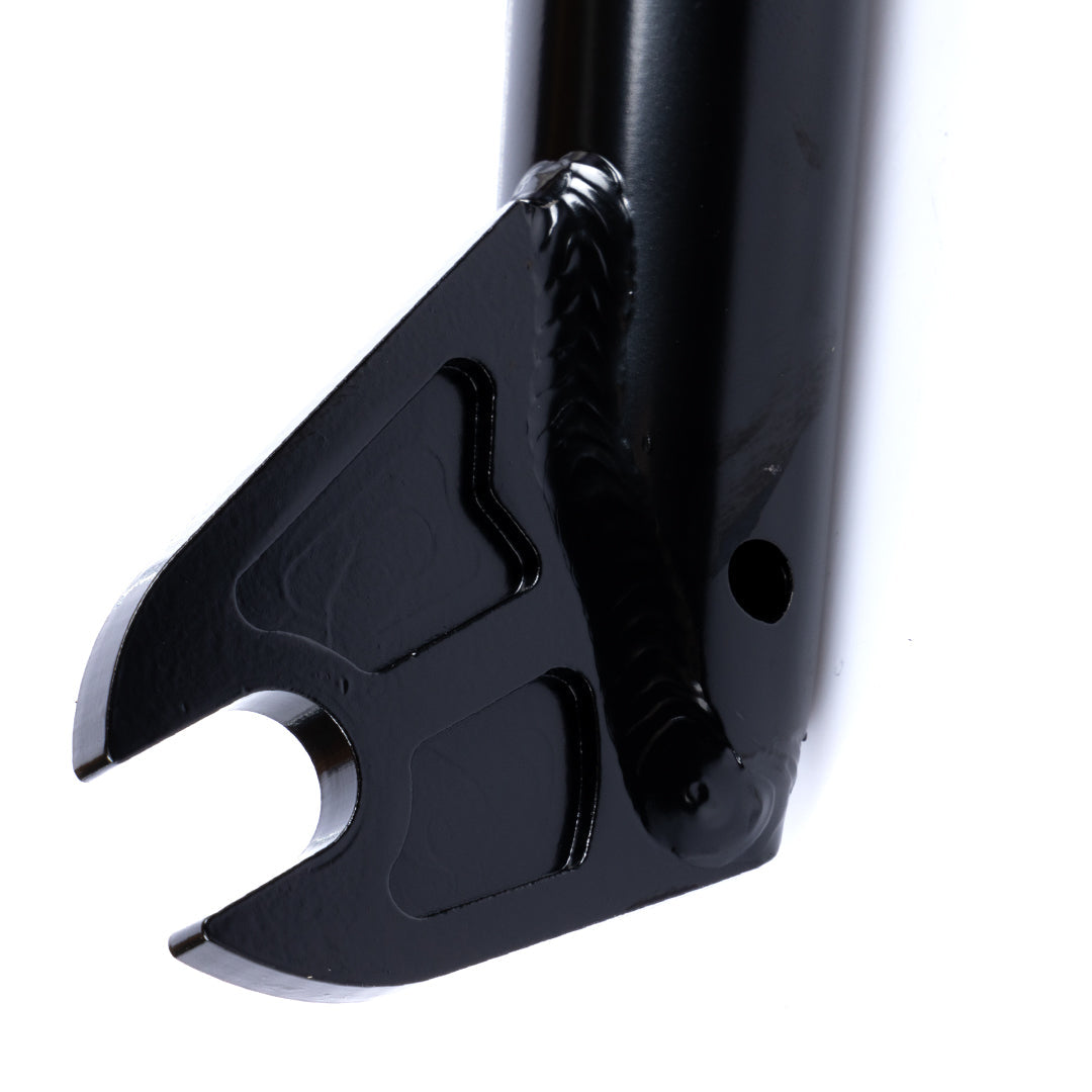 The Tall Order Setup fork uses slim profile triple butted tapered legs for extra strength and feature a peg notch at the bottom for peg and hub guard clearance. The dropouts are CNC 5mm thick and lightened. The steerer tube is extended for gyro compatibility.